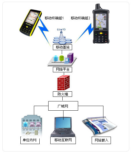 本系統(tǒng)采用特色的專業(yè)GPS終端,配合專業(yè)電子地圖圖資,在網(wǎng)絡(luò)平臺的支持下,通過基于瀏覽器(B/S)和客戶端(C/S)聯(lián)合的形式,實現(xiàn)現(xiàn)場人員、車輛、重要物資的定位監(jiān)控與指揮調(diào)度。